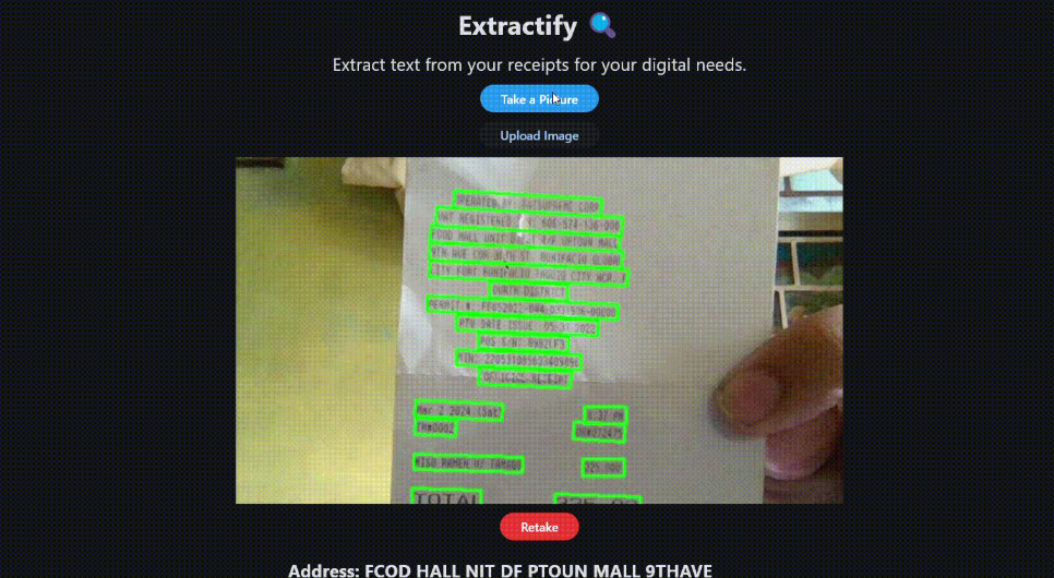 Extractify is an application designed to extract relevant details such as business name, address, TIN number, date, and total cost from images of official receipts using Optical Character Recognition (OCR) and Large Language Models (LLMs). The app supports both real-time image capture from a webcam and image uploads, making it easy to digitize receipts for personal or business needs.